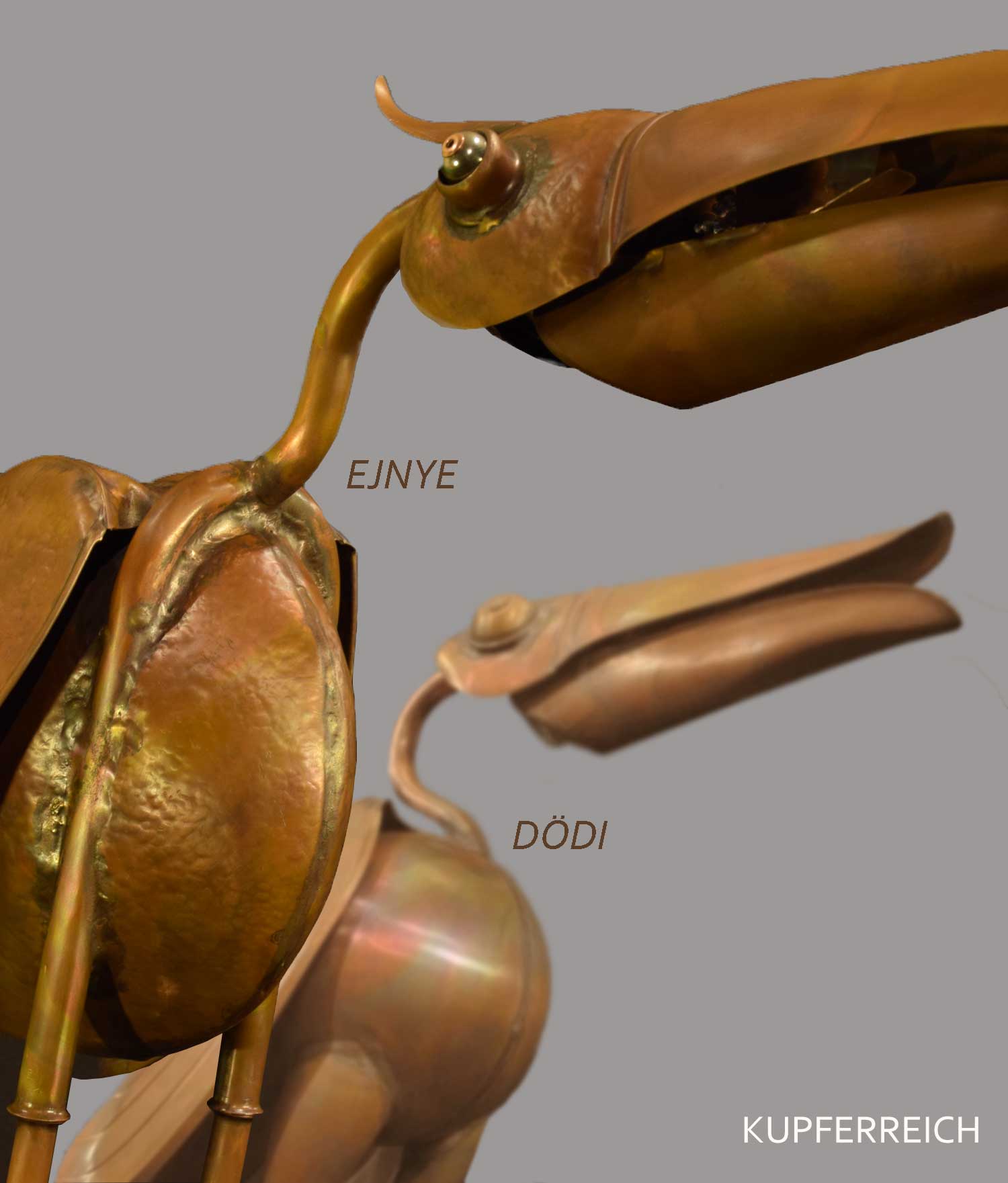 Megunhatatlan látvány, egy csepp öröm és sok-sok pozitív energia – ezt nyújtja Önnek szeretettel készített madárcsaládom. Csevegésükkel különleges hangulatot teremtenek a kertben. Sajátos formavilág, gondos kivitelezés és időtálló precíz műszaki megoldások teszik páratlanul egyedivé ezeket a vörösréz szobrokat. Megbízhatóság, forma, anyag és funkció egysége jellemzi az általam készített eredeti, mozgócsőrű madarakat már több, mint 25 éve.